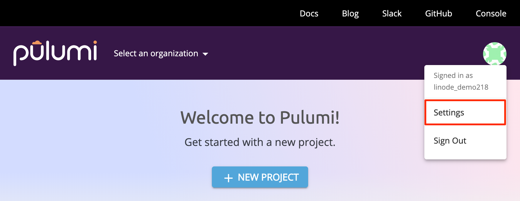 Log into your Pulumi account. After you’ve logged in, click on the avatar graphic to the top right of the Pulumi dashboard, then click on the Settings option in the dropdown menu that appears: