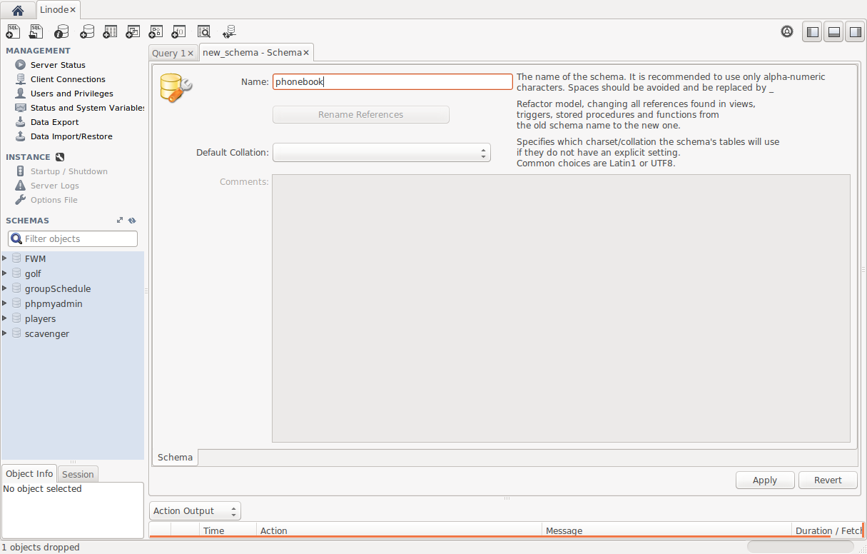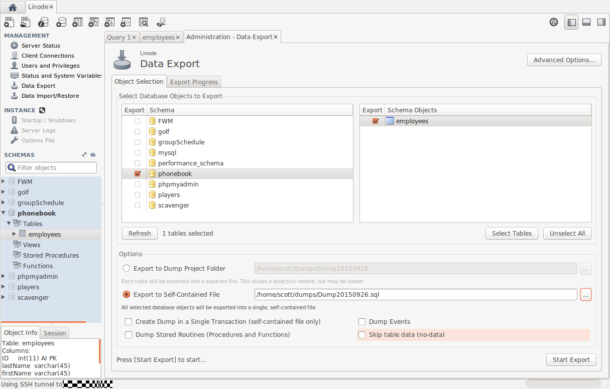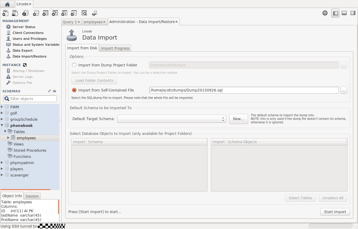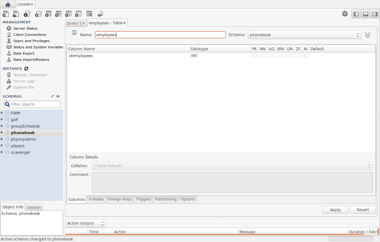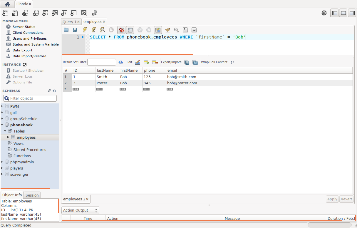 Now you’re back at the main database screen, and you see that phonebook has been added to the schema list. Double-click on any item in the schema list to switch to that database.