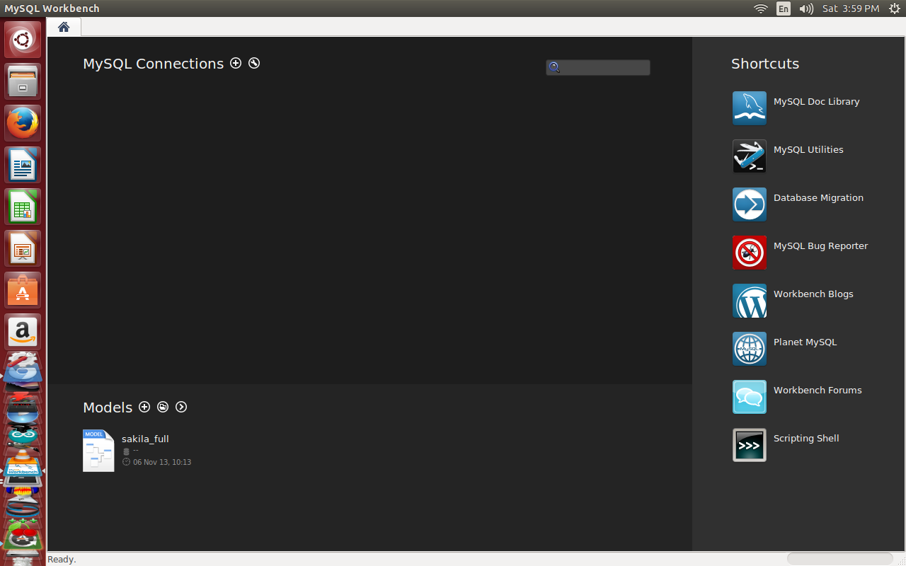 When you start MySQL Workbench, you’ll land at the home screen. Once you configure your database servers, as we’ll do next, then they’ll have shortcuts on the home screen.