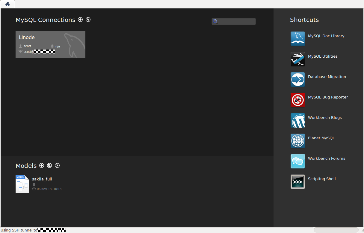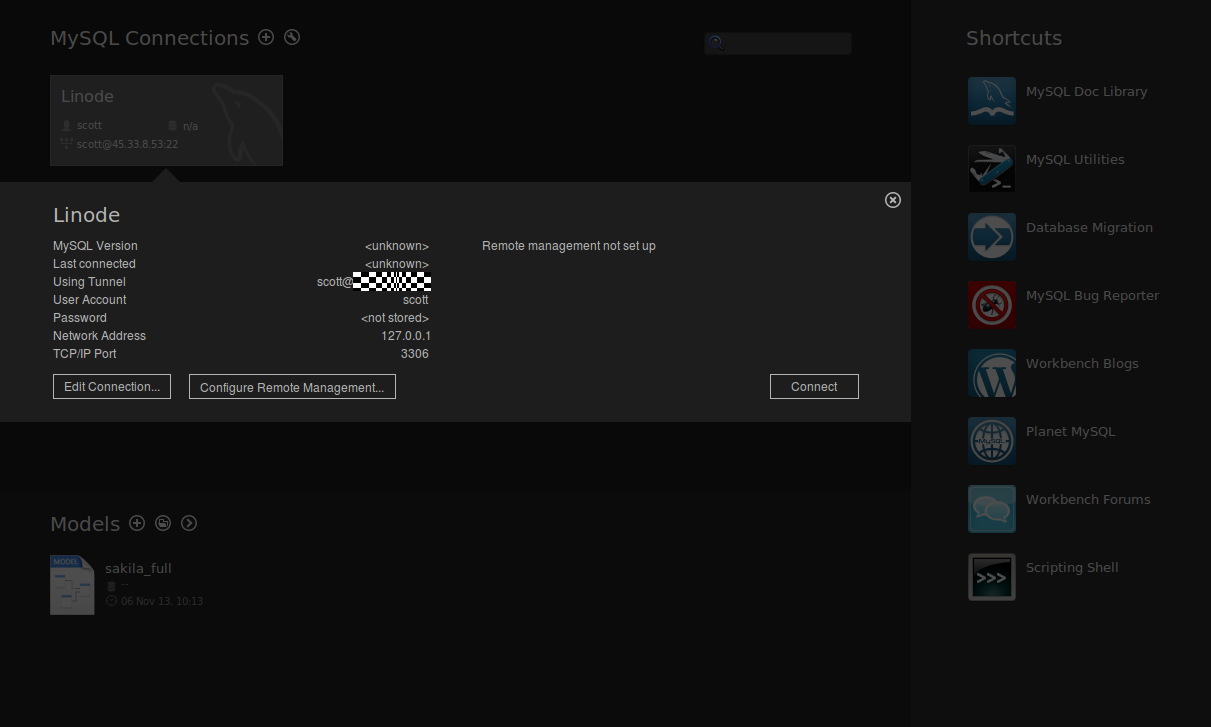 The first step after running MySQL Workbench is to add your Linode as a database server. You’ll need your MySQL username and password for this step. This is the same username and password you would use to login to phpMyAdmin or other administrative tools. If you just installed MySQL, then your username will be root