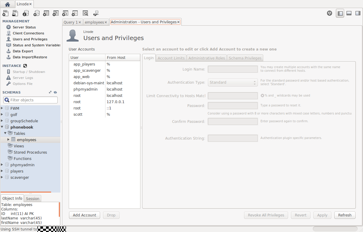 Just like it’s a bad idea to use the root account for “daily use” in the shell, the same idea applies inside MySQL. Workbench provides the capability to add, edit and manage user privileges. You can add a user and give assign privileges.