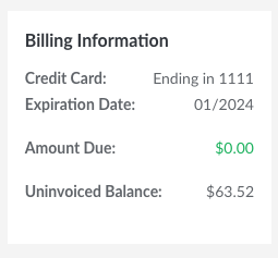 Here, you can keep track of your outstanding balance. In the example above, the customer has accrued a $63.52 balance for Linode services this month so far, but it has not been invoiced yet. You can check this as frequently or infrequently as you wish. It gets updated every hour as you use and add Linode services.