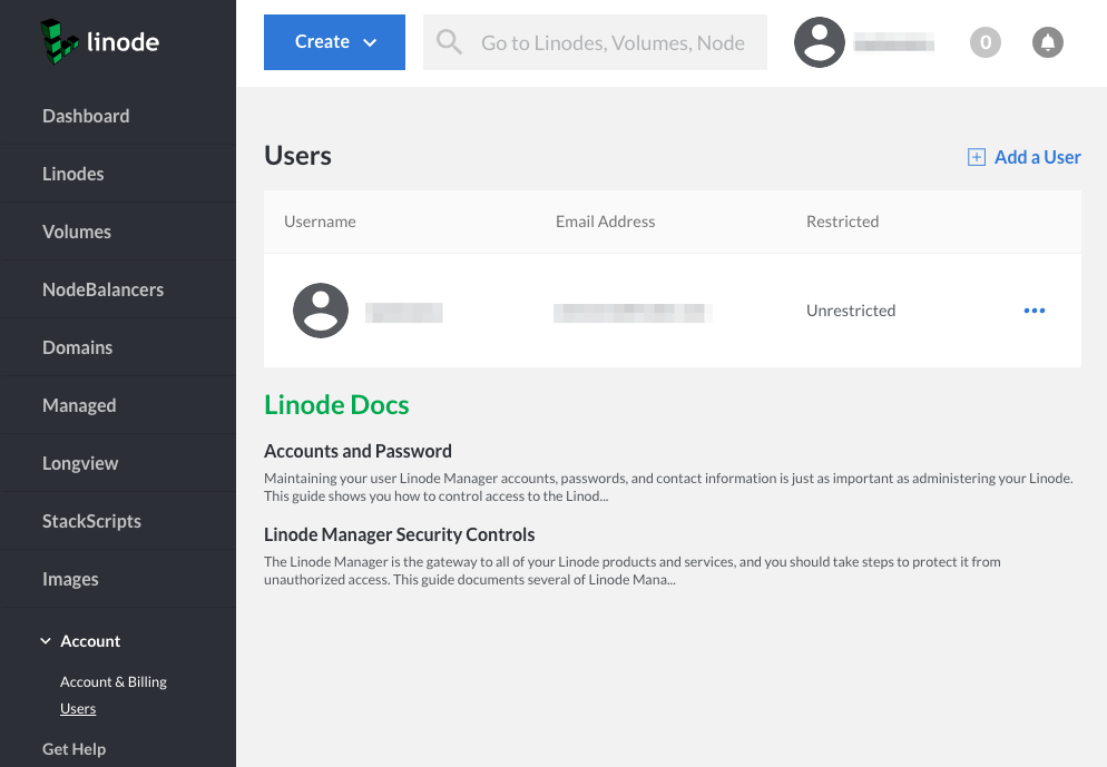 NoteA single user was automatically created for your account when you signed up for Linode. If you will be the only person accessing the Linode Cloud Manager, you won’t need to create any other users on your account.