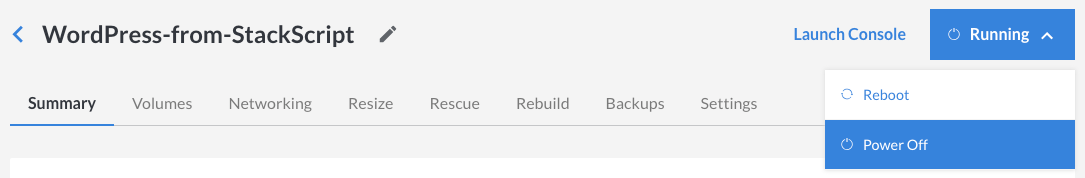 Click Power Off from the status menu to turn off your Linode. Monitor your bell notifications at the top of the page for a message indicating that your Linode has shut down.
