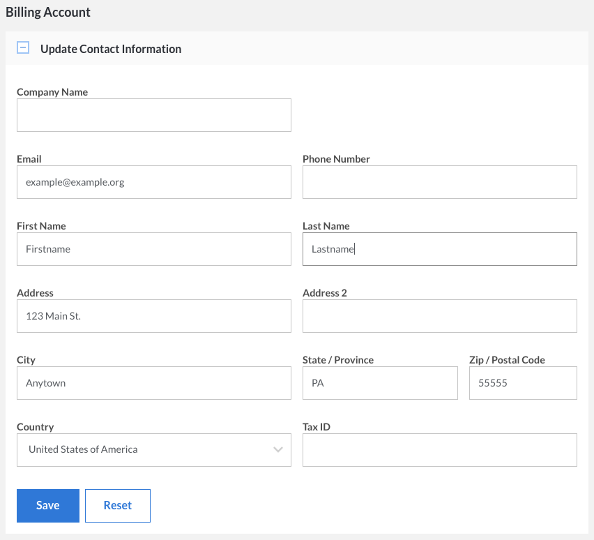 - Expand the Update Contact Information panel and update the contact information and the email address for the account.