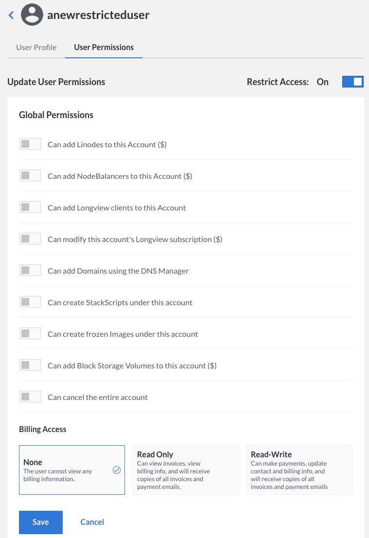 Granting access to settings denoted with a dollar sign ($) will allow the user to perform actions that incur billing costs, such as adding or resizing a Linode.Select an option for Billing Access permissions. These options are as follows: