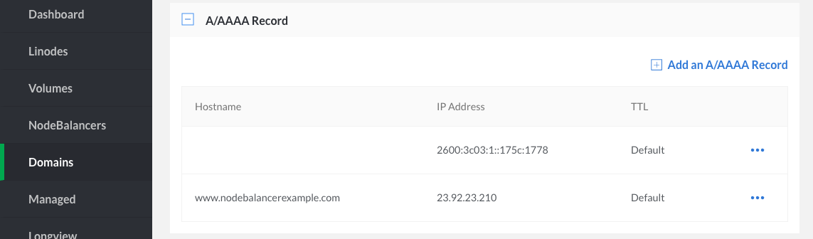 2. Edit or create an A record for your website’s domain name, pointing to your NodeBalancer’s IP address.