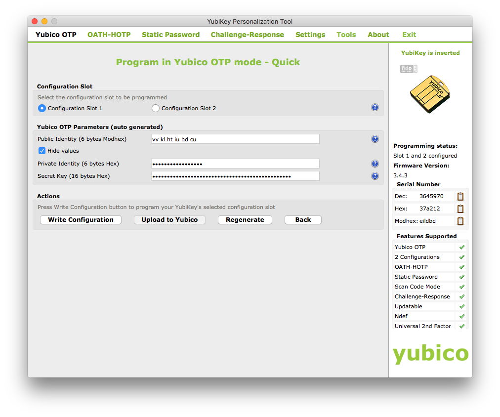 The page will respond with a table containing your key information. You should keep this data in a safe place. Should you ever lose your YubiKey, you will need this data to reconfigure a new one with the same settings.Test that your key works by following the instructions for single-factor authentication on demo.yubico.com. If it doesn’t, you may need to wait up to 15 minutes for your key to process on their servers.