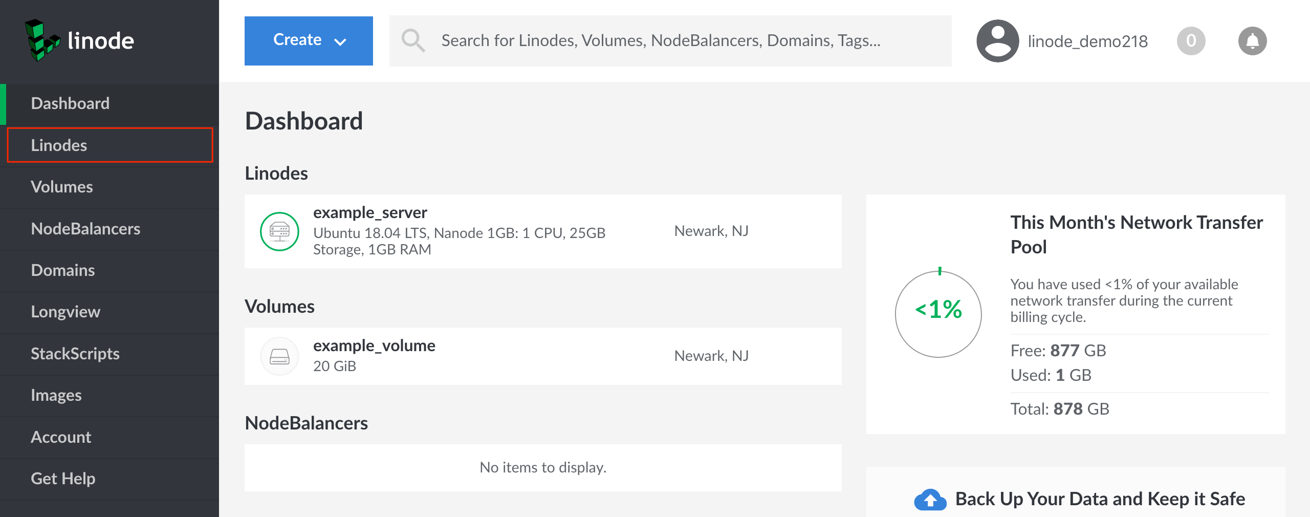 Linode Cloud Manager dashboard - Linodes sidebar link highlighted