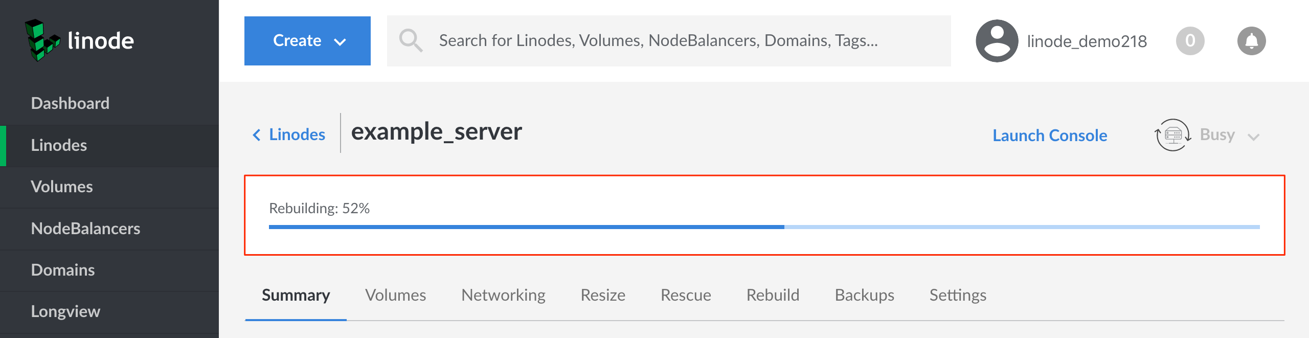 Linode Cloud Manager Linode detail page - Rebuild progress bar highlighted
