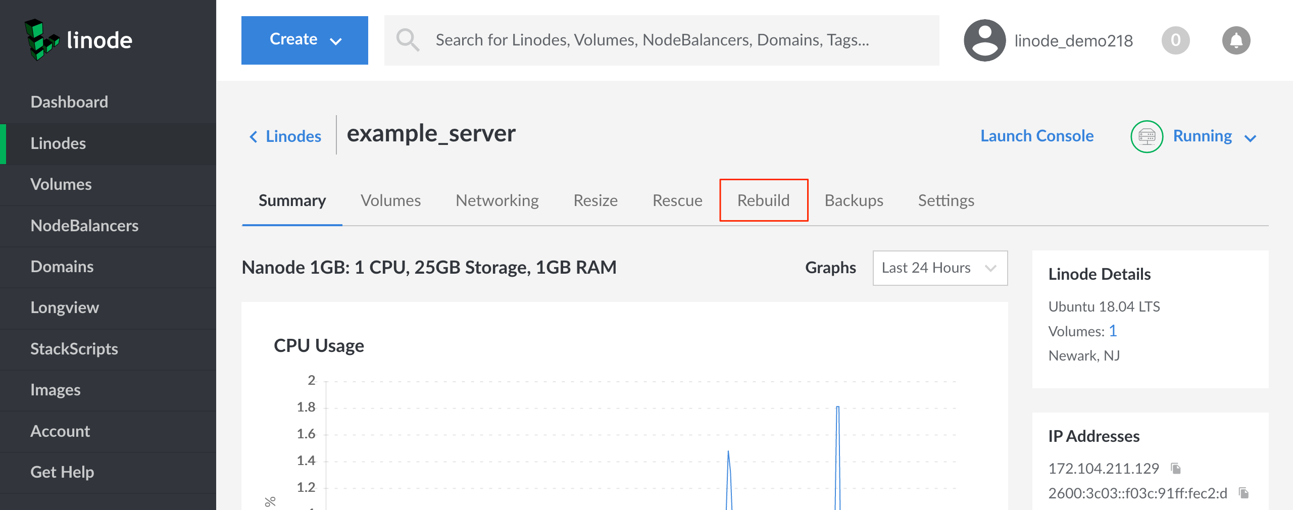 5. The Linode’s detail page will appear. Click on the Rebuild tab: