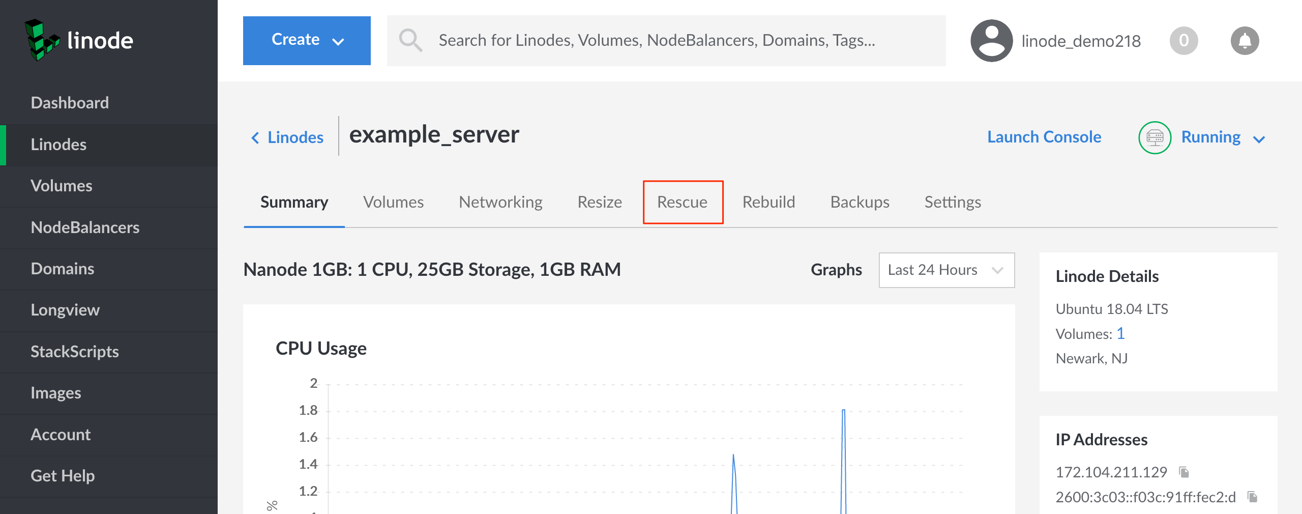 4. The Linode’s detail page will appear. Click on the Rescue tab: