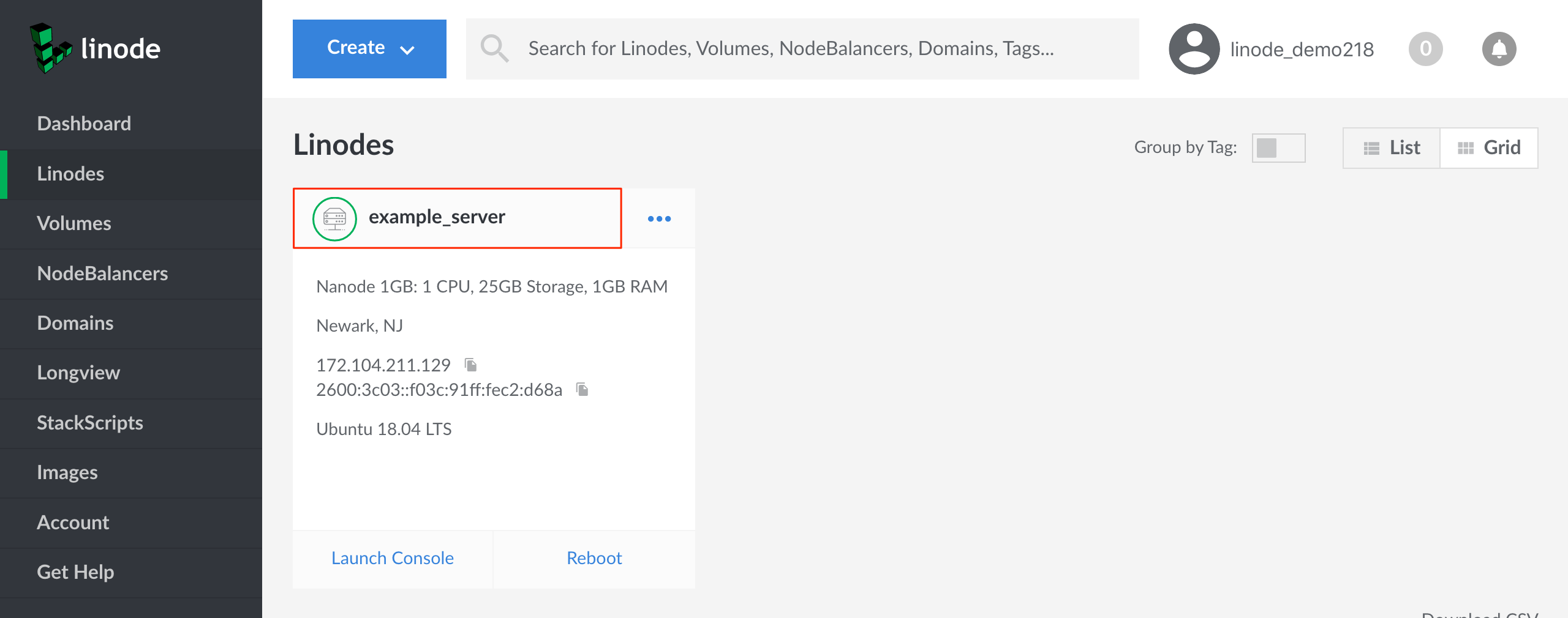Linode Cloud Manager Linodes page