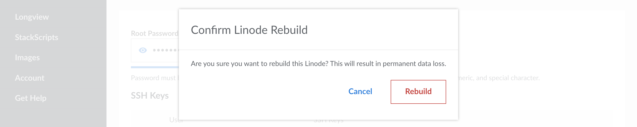 Linode Cloud Manager Rebuild form confirmation dialog