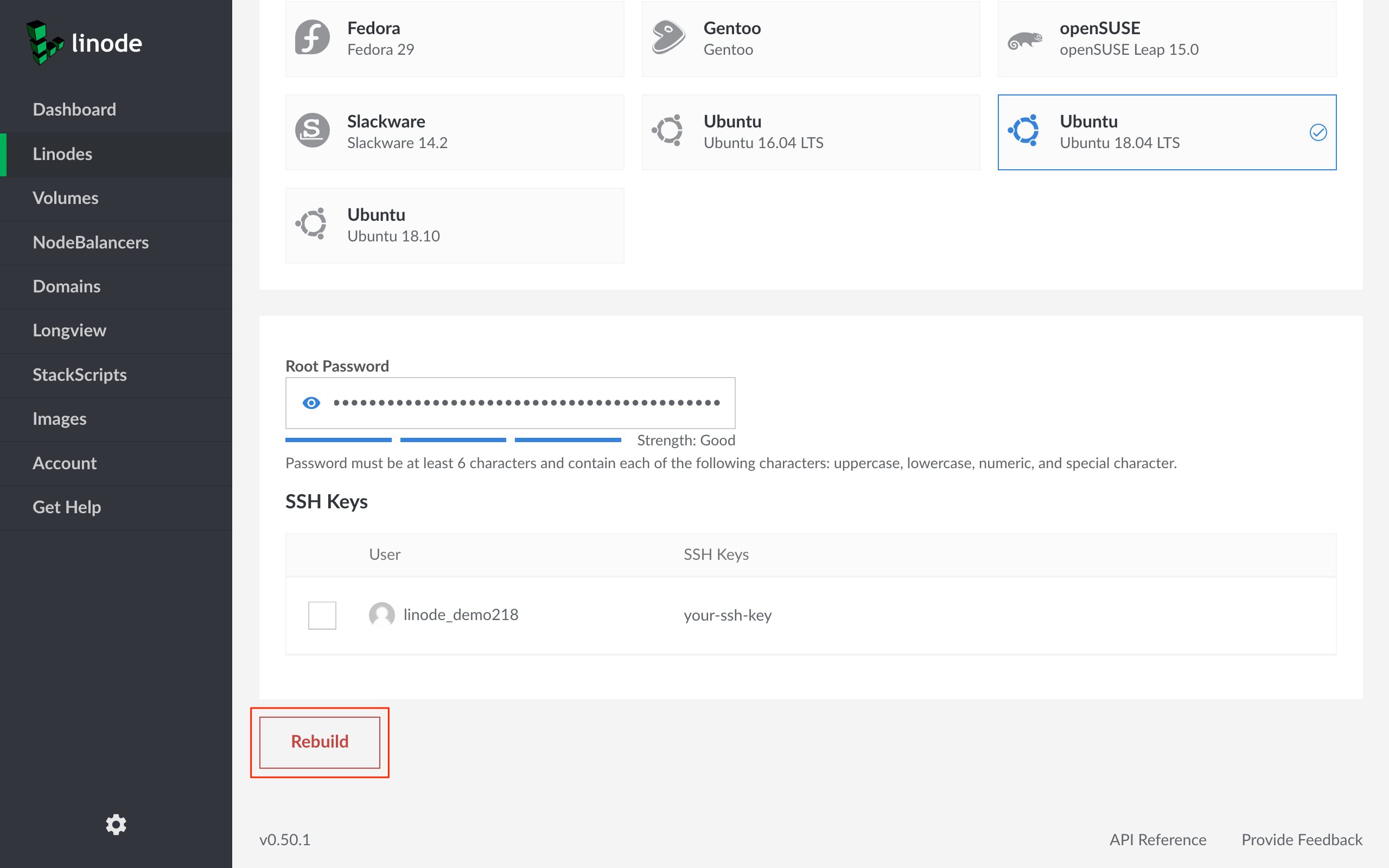 Linode Cloud Manager Rebuild form - Rebuild button highlighted