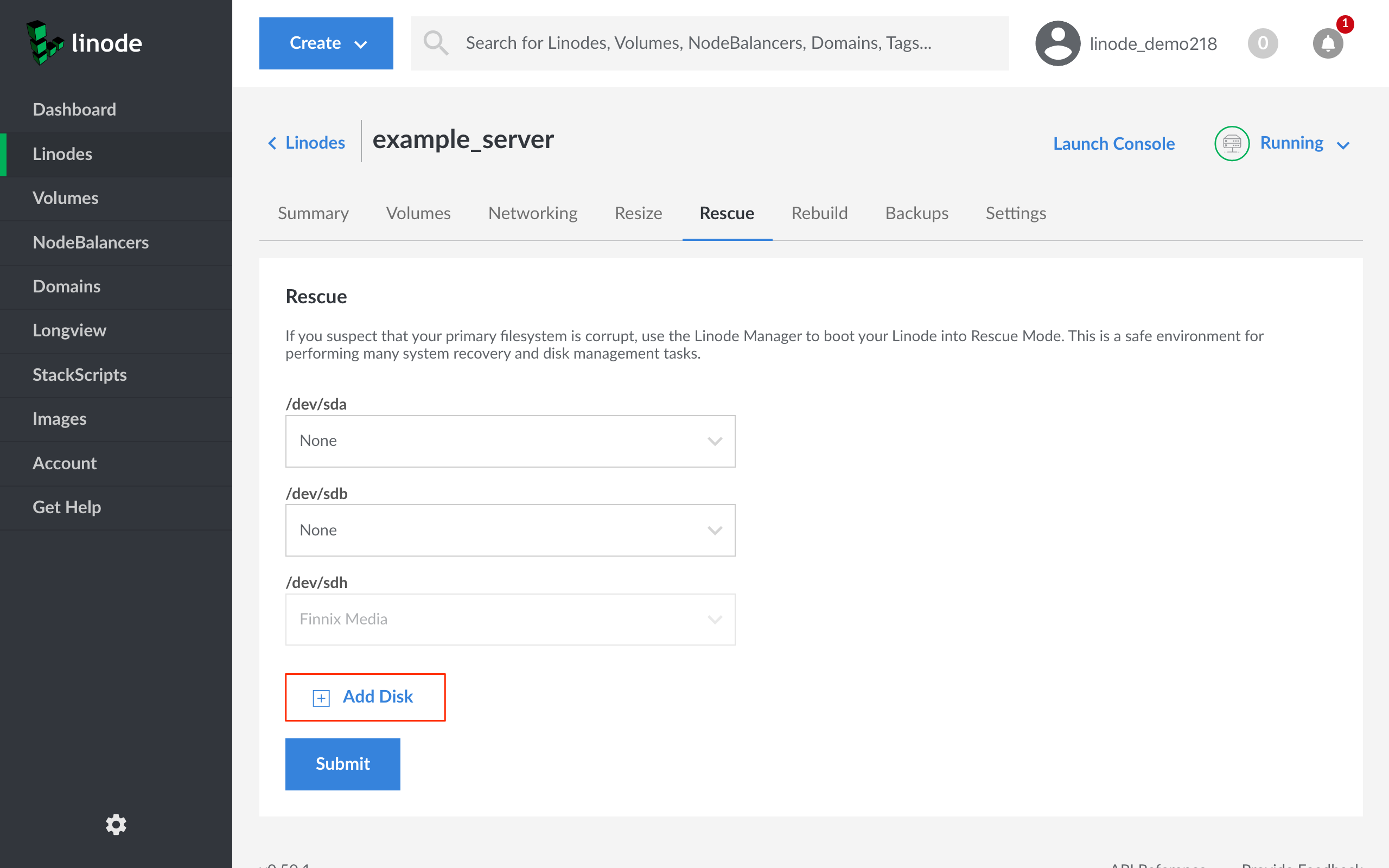 Linode Cloud Manager Rescue form - Add Disk highlighted