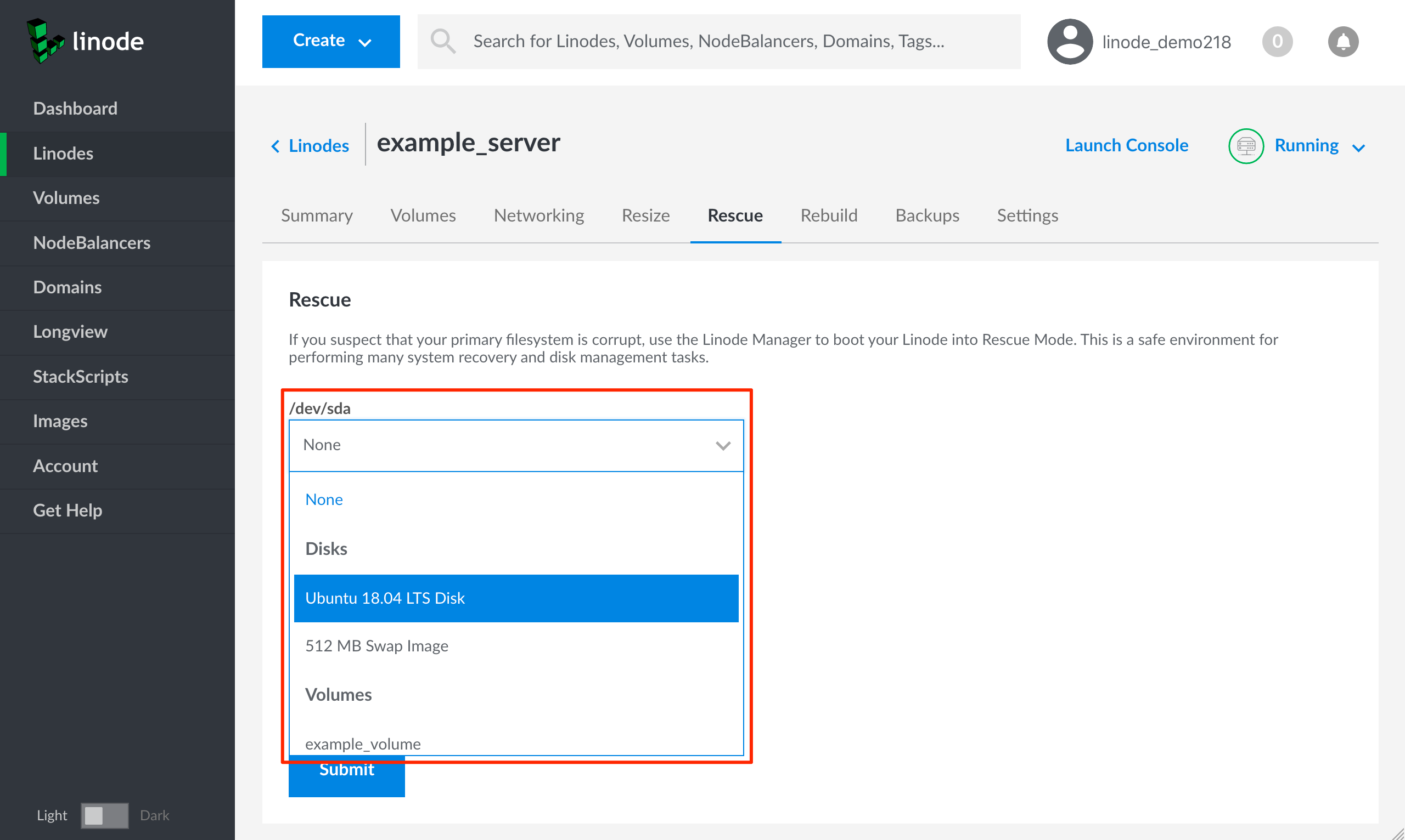 Linode Cloud Manager Rescue form - /dev/sda highlighted