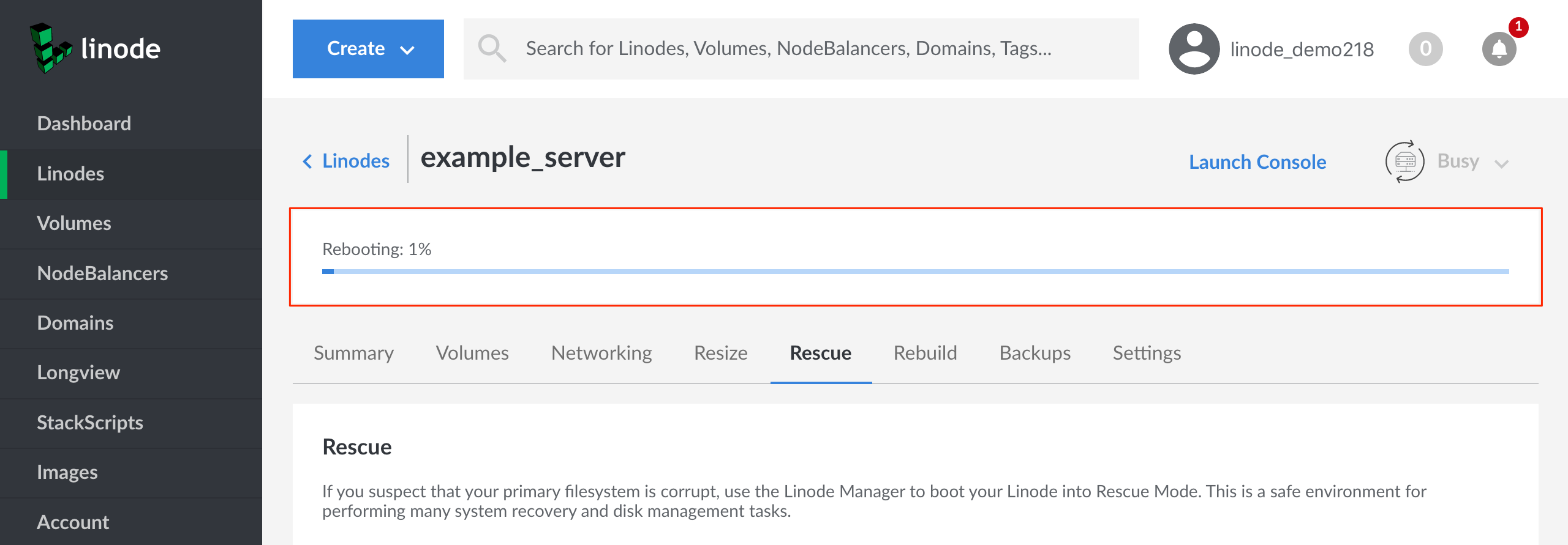 Linode Cloud Manager Rescue form - reboot progress bar highlighted