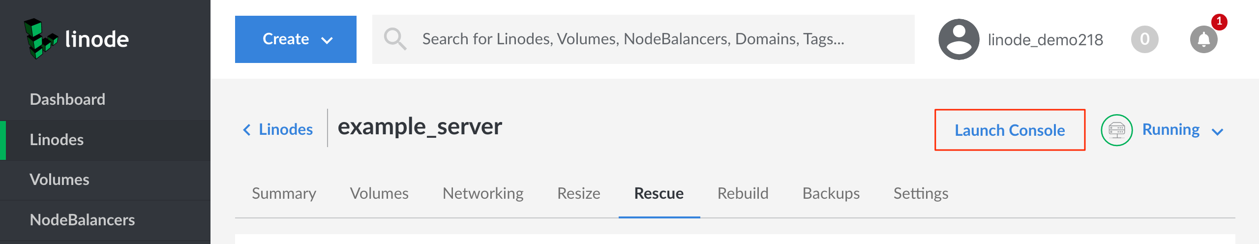 1. From the Linode’s detail page, click the Launch Console button: